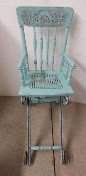 Albrecht Auctions Antique Oak High Chair Stroller Turquoise And